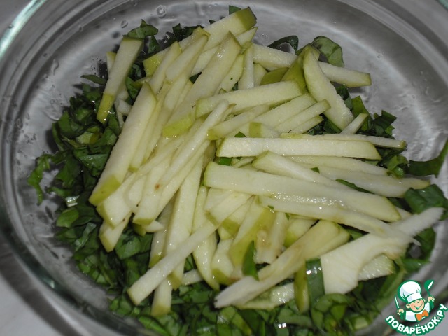 Яблоко разрезать пополам, очистить от семян и плодоножки, нарезать тонкой соломкой. Осторожно перемешать с половиной лимонного сока и выложить к шпинату.