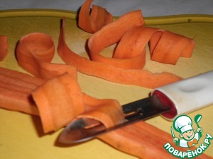 Морковь почистить, нарезать тонкими пластинками с помощью ножа для чистки.