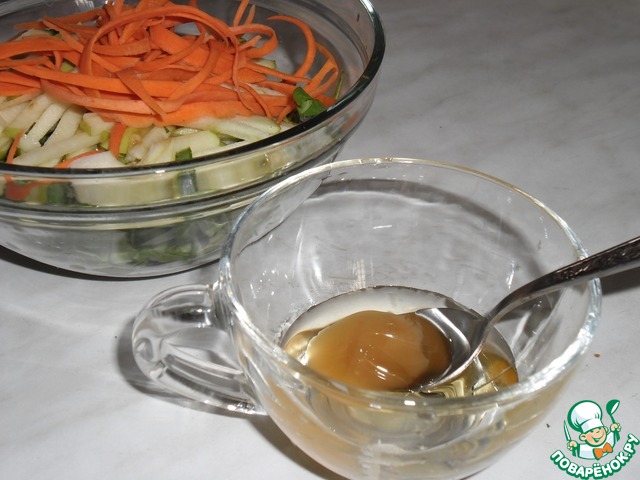 Смешать подсолнечное масло "Олейна", оставшийся сок лимона, мед и горчицу. Полить соусом салат.