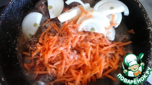 Печень обжариваем на подсолнечном масле с добавлением моркови и лука 10 минут, солим, перчим...