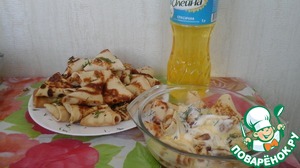 Взбивала 1 яйцо, ложку сметаны и зелень и залила смесью блинчики, поставила в предварительно разогретую до 180 градусов духовку на 15 минут...