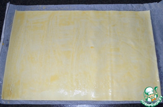 Слоеное тесто раскатать в два пласта, размером 42 Х 24см.