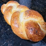 Включаем разогреваться духовку до 215град. вместе с противнем, на котором будем печь плетенку (таким образом создаем "под"). Верх косички смазываем взбитым яйцом, посыпаем маком. И снова смазываем яичком, прижимая мак к булочке.