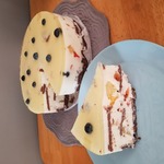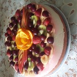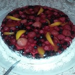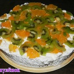 [+5]Я использовала три бисквитных коржа, которые прослоила творожно-сливочной смесью. В каждый из трех творожно-сливочных слоев добавила ягоды или фрукты.