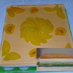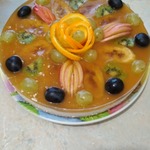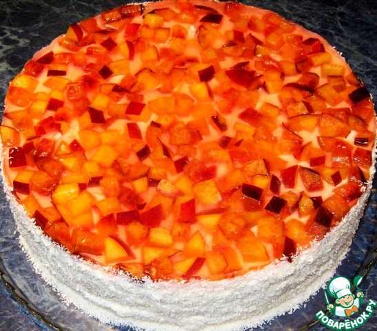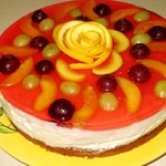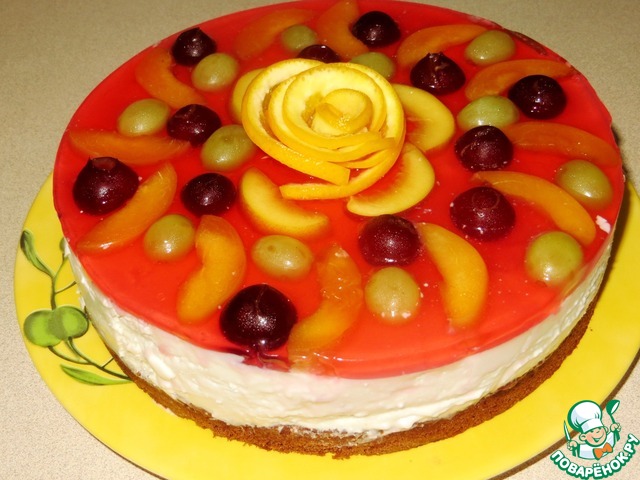 Украсить любимыми фруктами. У меня – консервированные абрикосы, виноград, яблоки, апельсин. Приготовить желе по инструкции на упаковке, аккуратно залить им фрукты. Оставить до застывания, а это происходит достаточно быстро.