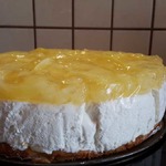 Подготовить желатин в соответствии с инструкцией на упаковке. Я пробовала делать торт и с листовым, и с обычным, и с быстрорастворимым, – результат одинаково хорош. Подготовленный желатин добавить к творожно-сливочной смеси, тщательно размешать, аккуратно вылить в форму на бисквитный корж. Поставить в холодильник для застывания, я оставляла на ночь.