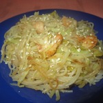Добавьте к капусте фунчозу, 1/2 стакана горячей воды, перемешайте и добавляйте соевый соус до тех пор, чтоб было солено по Вашему вкусу. У меня получилось 5 ст. л. соевого соуса. Добавьте креветки и аккуратно перемешайте.