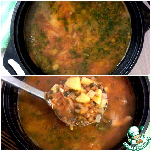3. Налить воды, чтобы она на 2 пальца покрыла чечевицу. Варить 1 час. Чечевица должна стать мягкой. Посолить, поперчить, добавить оставшееся масло, лавровый лист, орегано, мелко порезанную зелень ( по желанию).