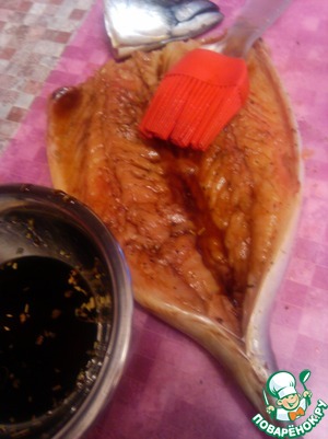 Кисточкой обильно смачиваем рыбу маринадом, оставляем на 20 минут