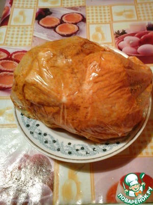 Разогреваем духовку до 180 градусов. Курицу обкладываем оставшимися зубчиками чеснока, кладем в рукав, ставим в разогретую духовку на 40-50 минут. Затем надрезаем рукав и ставим еще на 10 минут для образования румяной корочки.