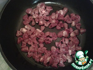 Мелко нарезаем сердечки и обжариваем на сильном огне. Когда они будет готовы добавляем к ним ложку с горкой муки и тщательно перемешиваем, чтоб не было комочков.