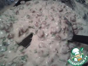Добавляем туда сметану. Далее добавляем примерно пол стакана воды и перемешиваем. Солим. Получается вот такой подлив.