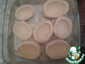 Из сырого картофеля вырезаем серединку, стенки стараемся оставлять как можно тоньше. И кладем в воду.