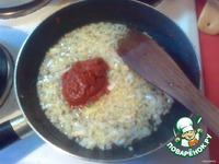 В слегка поджаренный лучок добавляем ложку томат-пасты. |