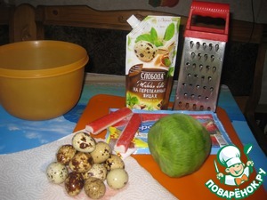 Подготовим необходимые ингредиенты. Крабовые палочки (если были заморожены) размораживать не нужно, пока мы их режем - они сами разморозятся, а салат будет сочнее. Яйца необходимо предварительно сварить - перепелиные варятся вкрутую 3 минуты. Самое сложное для меня в этом салате - это чистить перепелиные яйца от скорлупы =)