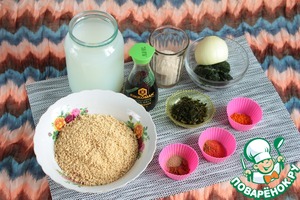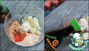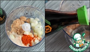Для третьего слоя прокрутить в блендере 1/3 фарша соевого, 1/3 репчатого лука, 1 ст. л. цельнозерновой муки, порошок аджики, сладкую паприку и 1 ст. л. соевого соуса "Kikkoman".