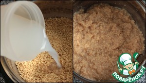 Соевый фарш залить теплым рисовым отваром и оставить на 20 минут для разбухания.