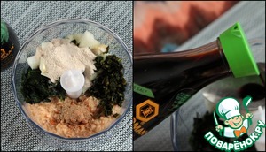 Для первого слоя прокрутить в блендере до более однородной массы 1/3 фарша соевого, 1/3 репчатого лука, шпинат, укроп, 1 ст. л. цельнозерновой муки, орех мускатный, кардамон и 1 ст. л. соевого соуса "Kikkoman" (я использую с наменьшим содержанием соли).