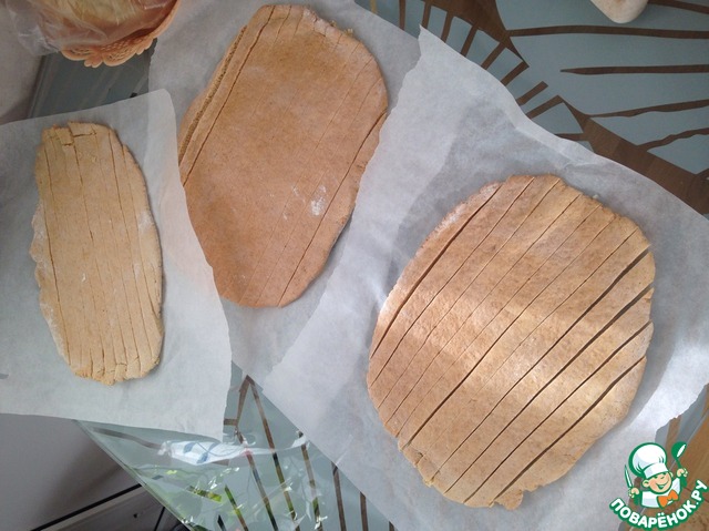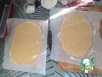 Каждую часть раскатать на пекарской бумаге посыпанной мукой, в прямоугольник, толщина примерно 5-7 мм.