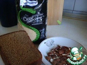 Теперь начинаем собирать торт: каждый кусочек хлеба быстро-быстро промазываем горячим сиропом, чтобы он не успел остыть и затвердеть, и посыпаем измельчёнными орехами.