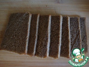 Хлеб нарезать кусочками толщиной 0.5-07 мм. Корочки со всех сторон срезать.