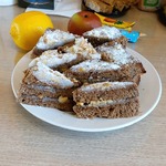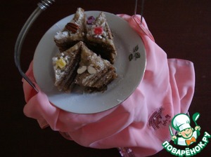 Затем режем торт на пирожные, украшаем их сахарной пудрой, цукатами и орехами, и несём гостям.