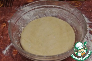 Уложить в миску, слегка присыпанную мукой и затянуть пленкой. Оставить в тепле для подъема на 1 час.