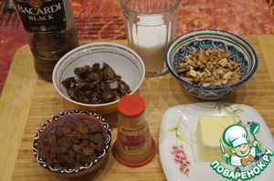 Финики и курагу нарезать кусочками размером с изюм. Орехи измельчить скалкой в довольно крупные кусочки. Изюм, курагу и финики залить коньяком или ромом на 1 час. -
