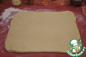 Выложить тесто на стол и раскатать в пласт толщиной 1 см. Край, с которого вы начнете сворачивать рулет, должен быть чуть толще противоположного.