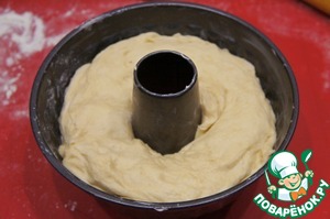 Свернуть плотный рулет, и уложить в смазанную маслом круглую форму с отверстием посередине швом вверх. Края рулета сверху слегка защипать. Кончики я отрезала и у меня получились еще две булочки-розочки.