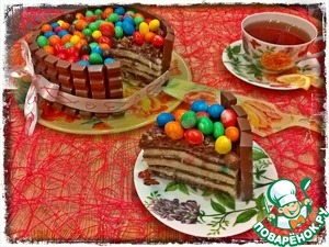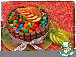 Теперь приступаем к украшению. Лучше если кто-то вам поможет подержать шоколад. Я делала одна, поэтому шоколад все время норовил упасть. Я его ставила немного под наклоном к центру тортика, а затем уже лентой сдавила и выровняла. Шоколада у меня ушло 4 упаковки большие, там где по 8 шт. При открытии некоторые были поломаны сразу, поэтому лучше чтоб шоколад был в запасе. Когда ленточкой обмотаете, сверху на наш тортик выложите массу из обрезанных панкейков, тем самым выравнивая поверхность. Конфеты я сразу не выкладывала, тортик поставила на балкон для пропитки и полного застывания крема. Через два часа мне пришлось уже доставать и украшать, так как сын уже должен был вернуться с садика. Но лучше конечно подождать часа четыре. Сверху выложить конфетки Ммдемс. Для деток добавила пару лебедей из яблочек.