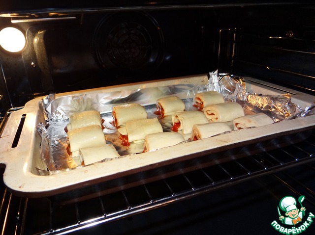 Застилаем противень бумагой для выпечки, или фольгой, смазываем растительным маслом. Кладём туда наши рулетики. И отправляем в духовку, до румяности. Это примерно 15-20 минут. -