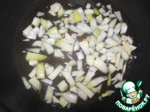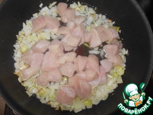 Лук нарезать кубиками, и на растительном масле обжариваем. Периодически помешивая, пока нарезаем курицу.