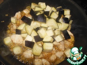 Курицу нарезать кубиками добавить к луку. Жарим периодически помешивая, пока готовим баклажаны. Немного посолим, добавим специи для курицы.