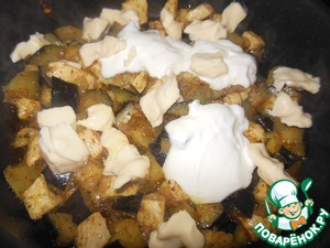 Добавим 3 ст. л. сметаны, карри. Сыр кубиками добавить к блюду. Тушить 10-15 минут.
