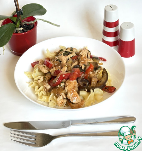 Довольно интересное блюдо! Очень аппетитное и ароматное! Сливочная сочная курочка, яркий баклажан почему-то особо и не ощущается, а практически растворяется в сливочном соусе!!! Приглашаю к столу!