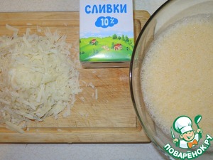 Яйца взбить с солью, добавить тертый сыр, муку и сливки, перемешать.