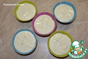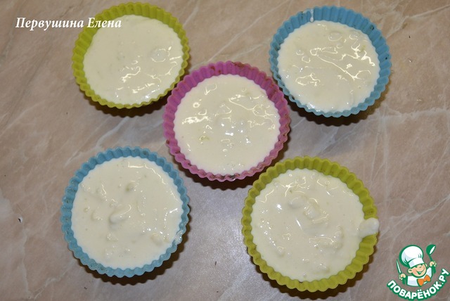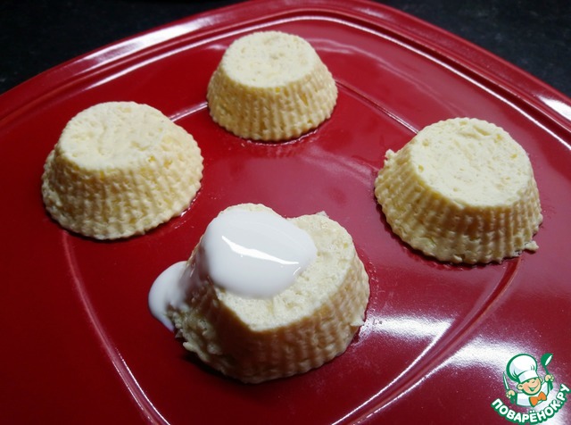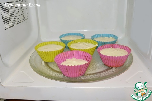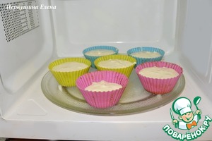 Поставить формы в микроволновую и при полной мощности (у меня 700Вт) запекать минут 5-7.