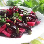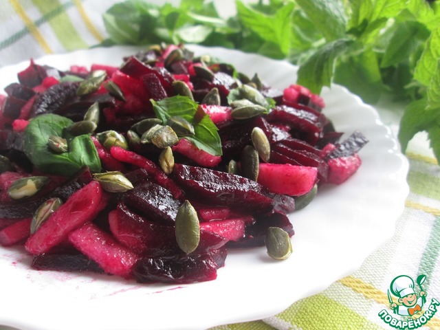 В чашке смешать свеклу, грушу, посолить, посыпать по желанию черным свежемолотым перцем, полить заправкой. При подаче посыпать кедровыми орешками с листочками мяты.