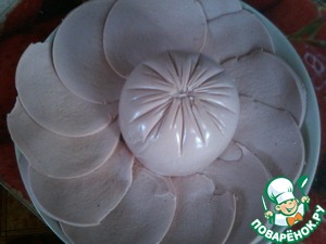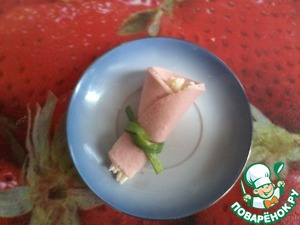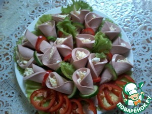 А теперь по рецепту:у меня был сыр а внутри острый сырно-чесночный салат.По виду-цветы каллы.Красиво.Именно закуска на один зуб и эффектно смотрится.Добавила в сырный салат ложечку соуса песто.Очень ароматно.Я еще сверху слегка припорошила пармазаном..