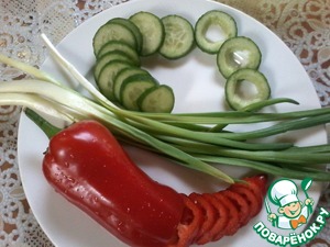 Огурец порезать кружочками и удалить сердцевину, перец - кружочками.