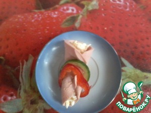 Свернуть из кружочков колбасы конусообразные кулечки (ушки) и уложить в получившийся стаканчик салат, надев на каждый кулечек в виде "зажима" огурчик или перчик.