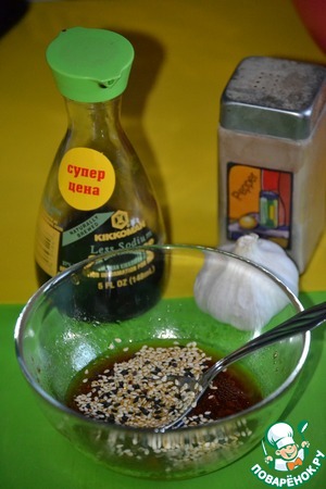 А вот и до заправки добрались! В отдельной чашке смешиваем наши составлющие: соевый соус Kikkoman+зубчик чеснока (через пресс)+сахар+сок лимона, перчик по вкусу+кунжутное семя+масло (если позволяют дни поста, если нет, то не включаем его в заправку). Соус должен получиться кисло-сладко-соленым и с ароматом чеснока.