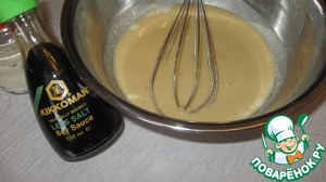 Добавляем сюда же соевый соус "Киккоман" и сахар, перемешиваем до растворения