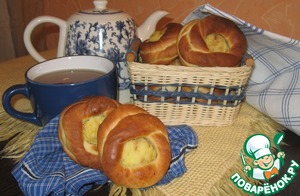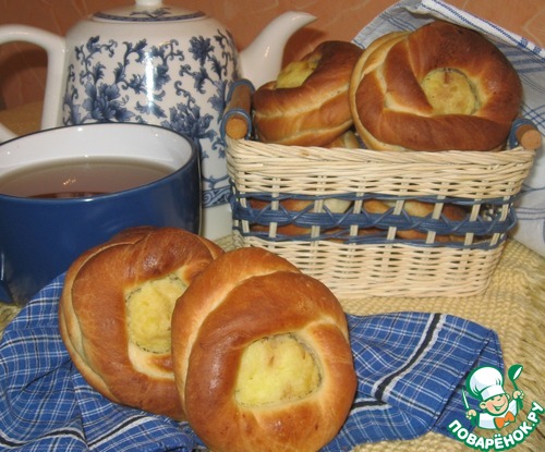 После того, как тесто подошло, обминаем его, добавляем муки, если необходимо, и разделываем ватрушки, кладём в них начинку.