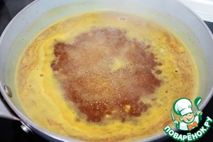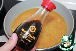 Добавляем выжатый из апельсина сок, овощной бульон и соевый соус Kikkoman. Пробуем соус должен получится кисло - сладкий на вкус. При необходимости на ваш вкус добавляем либо овощного бульона, либо соевого соуса. Солим и перчим по вкусу.