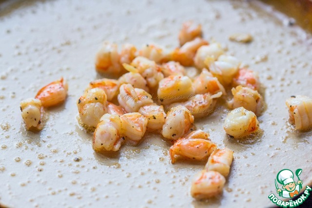 На сковороде распускаем сливочное масло и обжариваем креветки 2-3 минуты. Соли и перчим.