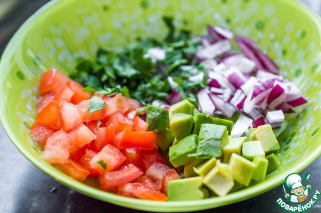 Из помидора убираем сок и семена. Нарезаем на кубики помидор, авокадо и лук, мелко рубим петрушку. Присаливаем совсем немного, поскольку подаем с соленой фетой и у нас в заправке есть соевый соус.