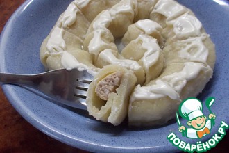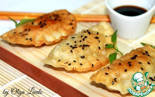 Из теста сформировать " колбаску ", разрезать на равные кусочки, тонко раскатать, на каждый положить по 1 ст. л начинки и защипать края, удобным для вас способом