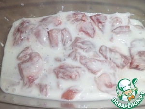 Свинину нарезаем некрупными кусочками и замачиваем в кефире минут на 40. Можно не замачивать, но у меня было время и я сделала.